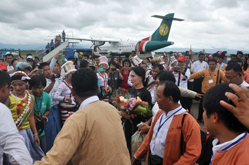 Residents welcome Aung San Suu Kyi on her arrival at Putao Airport (Photo – EMG)