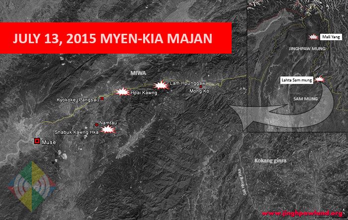 7月13日克缅双方在四个不同的地点发生交火,景颇共和国南部省<掸邦北部>独立军6旅36营防区与缅军99师部队交火,此缅军来自怒江东岸果敢方向,进入了克钦独立军六旅防区孟古地区。